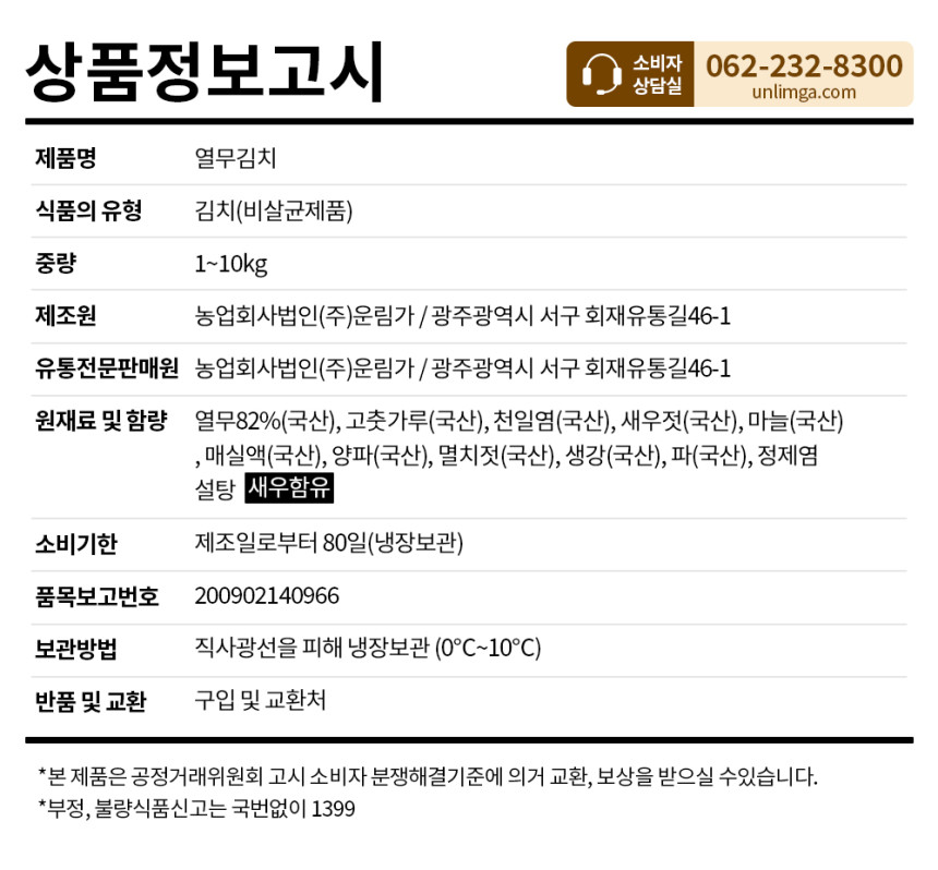 운림가 53년전통 국산 전라도 열무김치 2kg