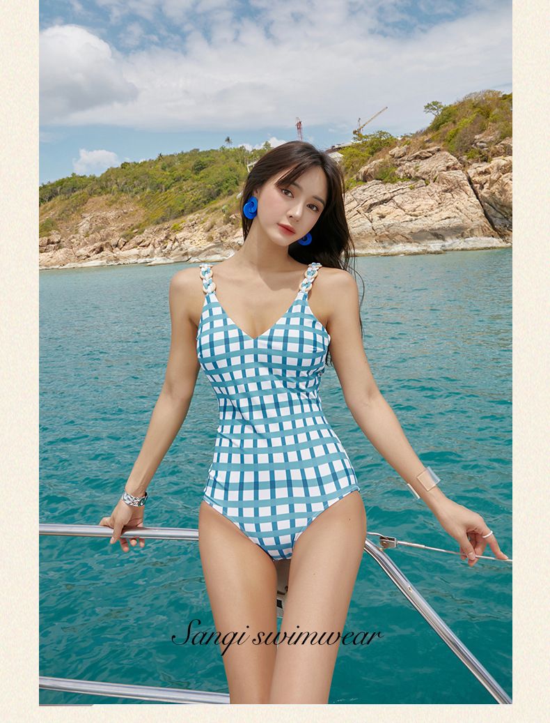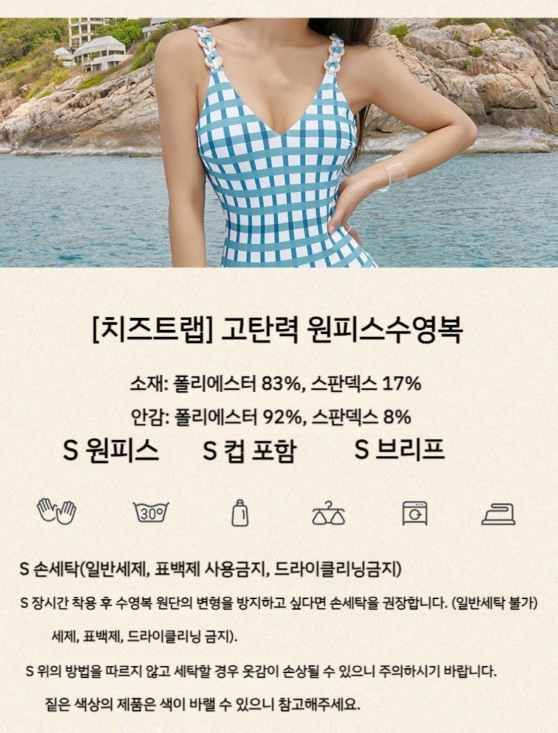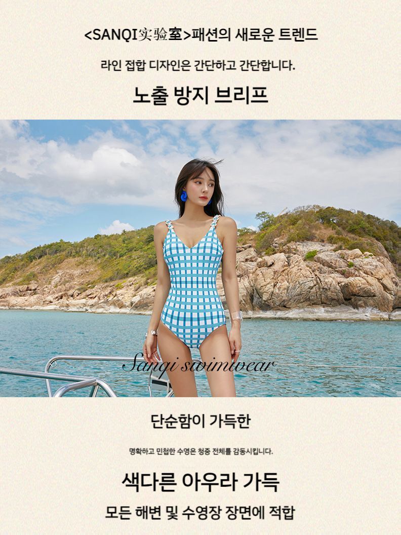 체크 삼각 점프수트 백리스 레트로 비치웨어