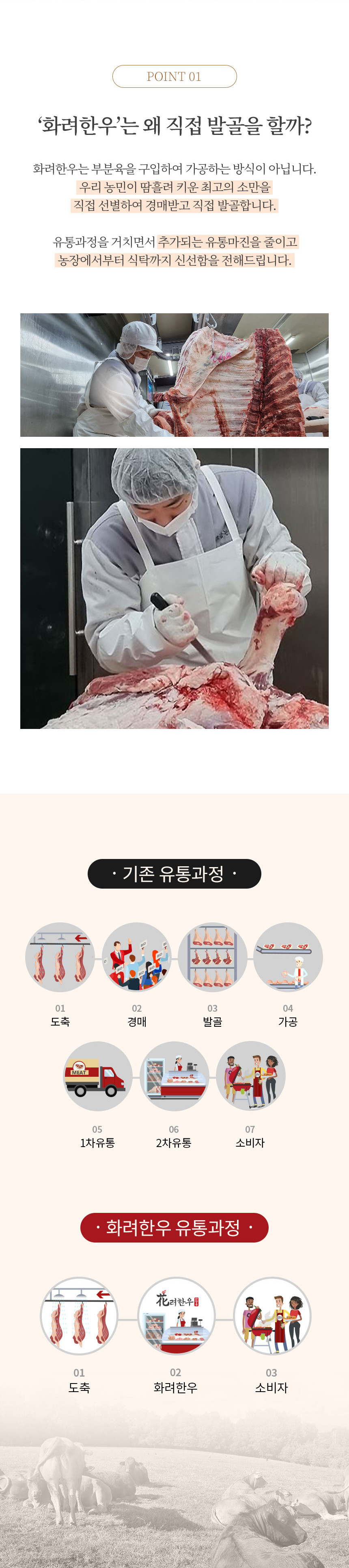 50년 역사의 마장동 축산물시장에서 2대째 최고의 한우 상품을 만들기 위해 밤 낮으로 연구하고 노력하며 구슬땀을 흘리고 있습니다. 기존 축산물 판매자분들과의 차별화를 위해, 최고의 원육선별에서부터 가공 ,숙성, 포장 ,패키징까지 저희만의 상품을 만들기 위해 소비자 니즈를 파악하고 매번 새로운 상품구성을 기획하고 있습니다.